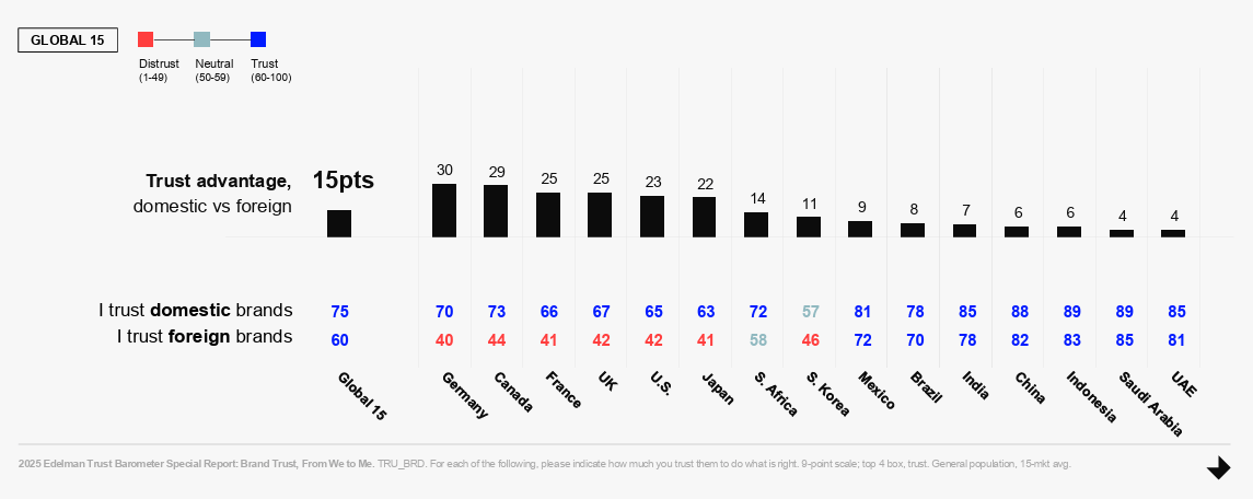 The 2025 Edelman Trust Barometer shows trust in homegrown brands now outpaces foreign brands by 15 points globally. In Germany and Canada, that gap hits 30 points. You can burn $50 million on a global campaign and you're still starting with a 30-point trust deficit against some local competitor whose entire advantage is that they're actually from there.